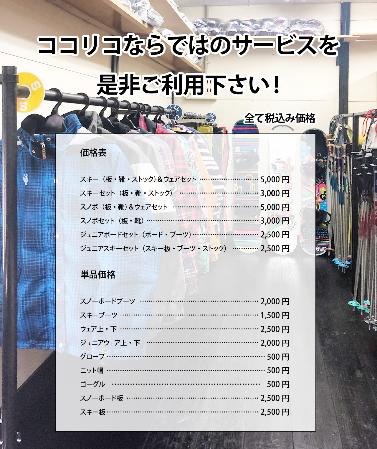 スキー・スノボレンタル、ココリコでは、スキー、スノボライフを満喫してもらうために、メンテナンスが行き届いた清潔なレンタル用品を幅広く取り揃えています。さらに、安心の破損保証など、充実したサービスをご提供しています。